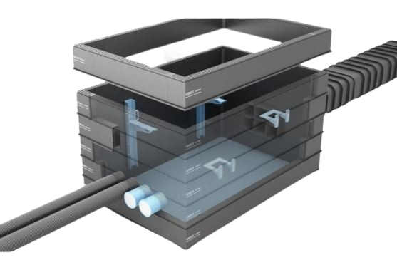 Our component-based stacking ring section chamber system is designed and tested to withstand a 40-tonne vertical load without the need for structural backfill. This product is used extensively in various market sectors including Telecommunications/FTTx, Highways including Traffic Signalling and Motorway Communications, Rail, Water and Power.