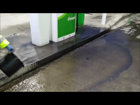 - Spills should be treated by pouring our bioremedial solution onto the spill diluted @10:1, leave for 10 minutes then simply brush and rinse off into the into the forecourt drain connected to the fuel separator.